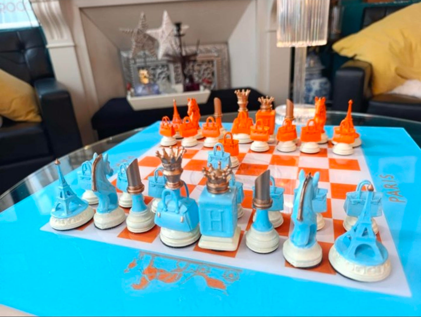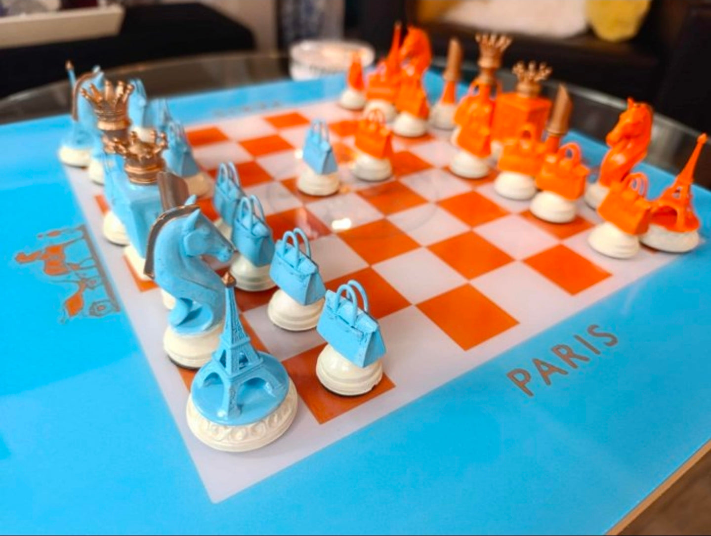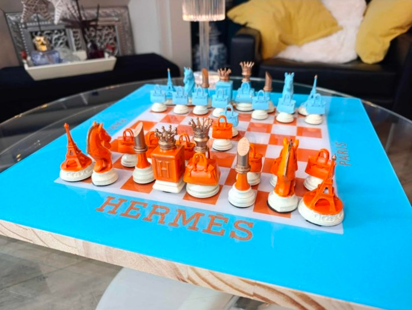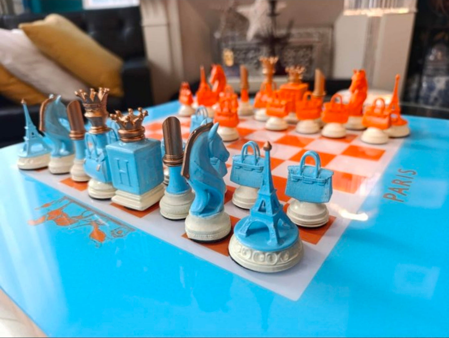 I pezzi, in resina pregiata verniciata a mano, alternano i toni azzurro Parigi e arancione Hermès in un raffinato contrasto cromatico. Ogni figura è ispirata all’immaginario della moda e dell’architettura: borse, rossetti, flaconi di profumo, cavalli e perfino la Torre Eiffel diventano protagonisti di un dialogo ironico e scultoreo.