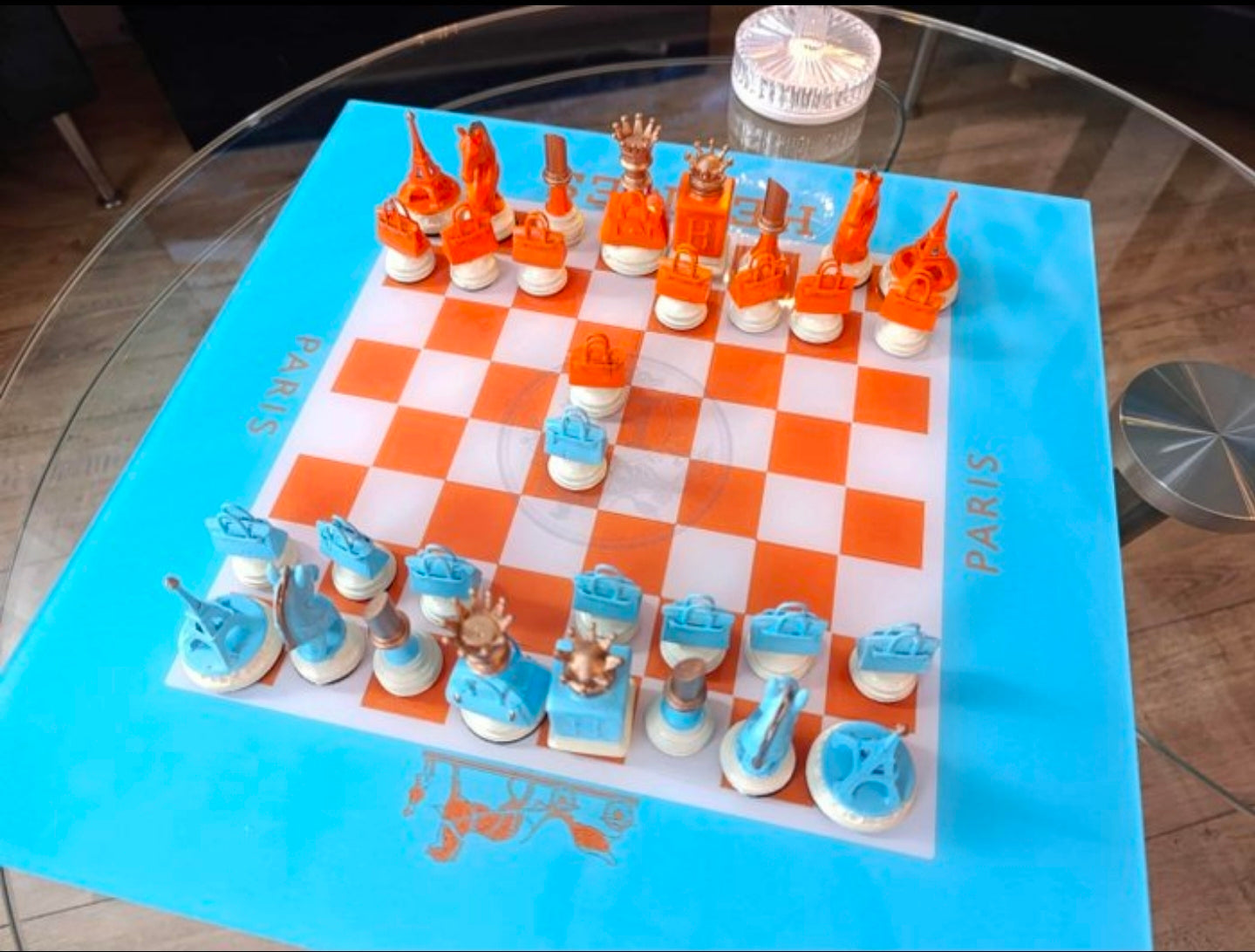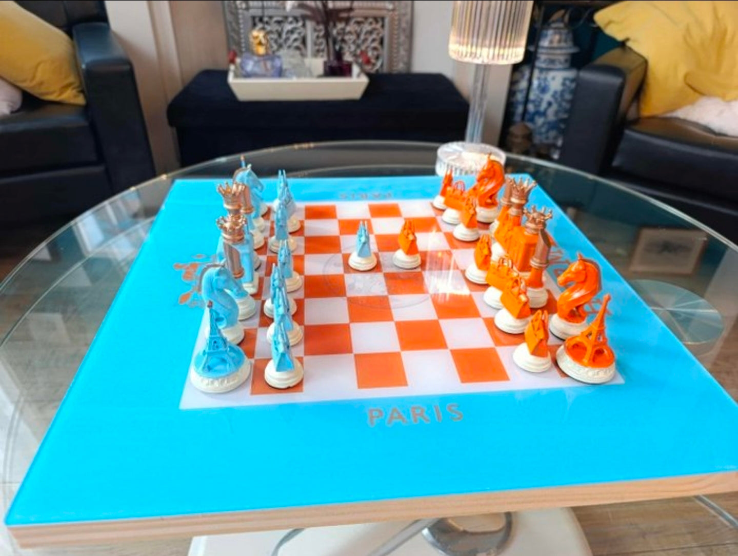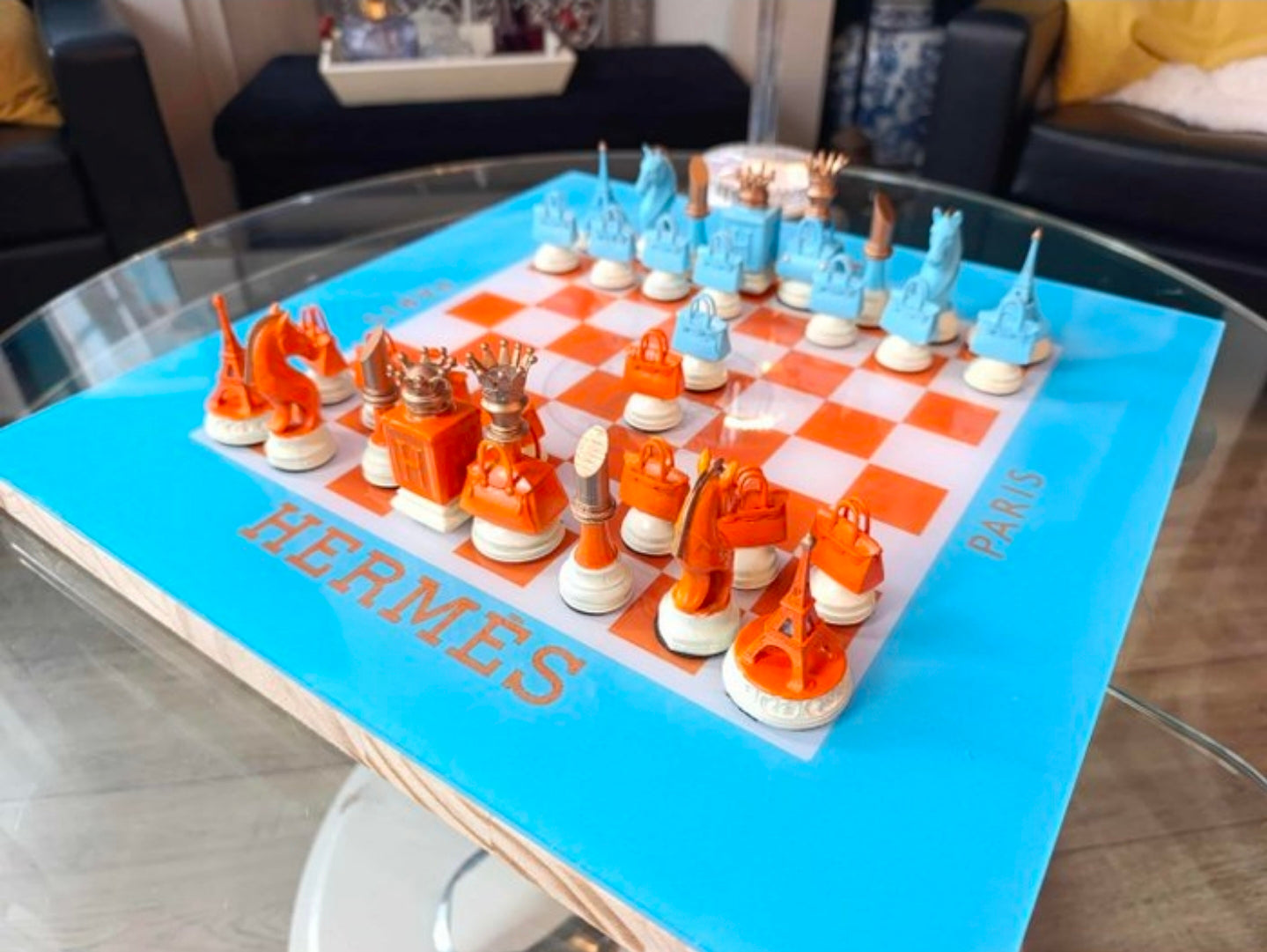 I pezzi, in resina pregiata verniciata a mano, alternano i toni azzurro Parigi e arancione Hermès in un raffinato contrasto cromatico. Ogni figura è ispirata all’immaginario della moda e dell’architettura: borse, rossetti, flaconi di profumo, cavalli e perfino la Torre Eiffel diventano protagonisti di un dialogo ironico e scultoreo.