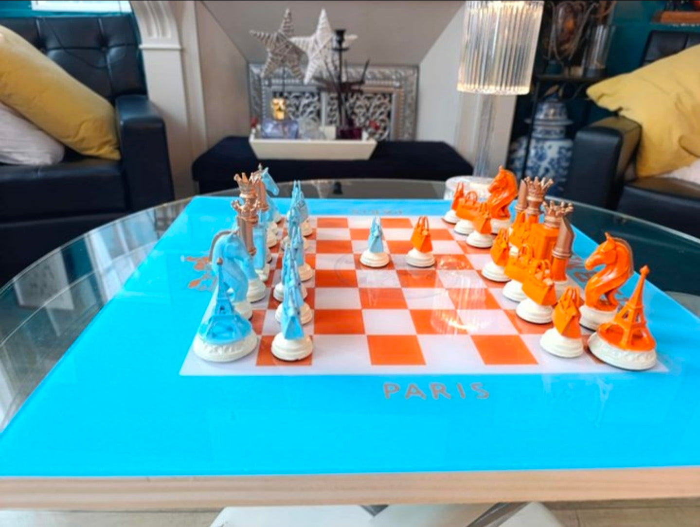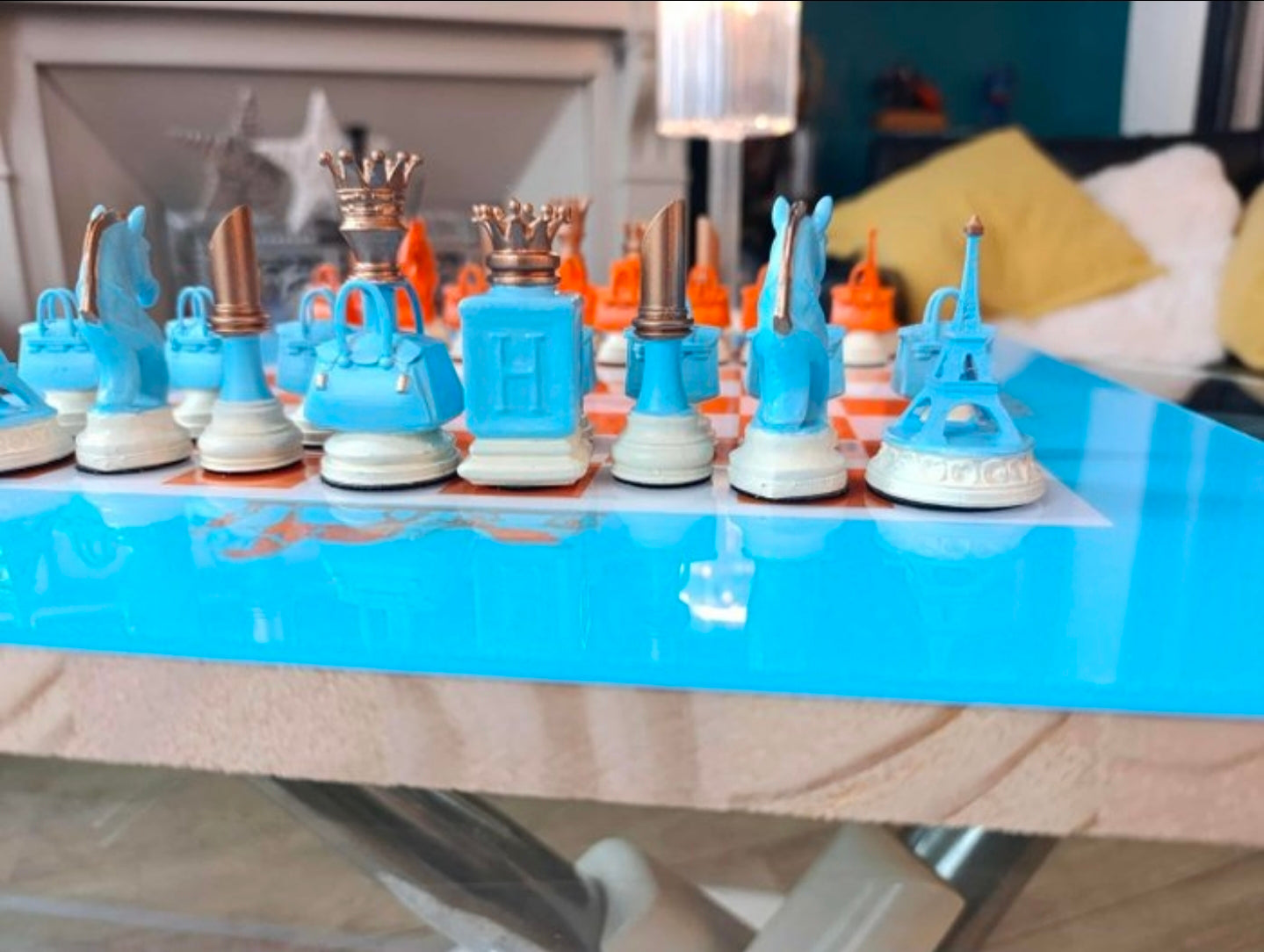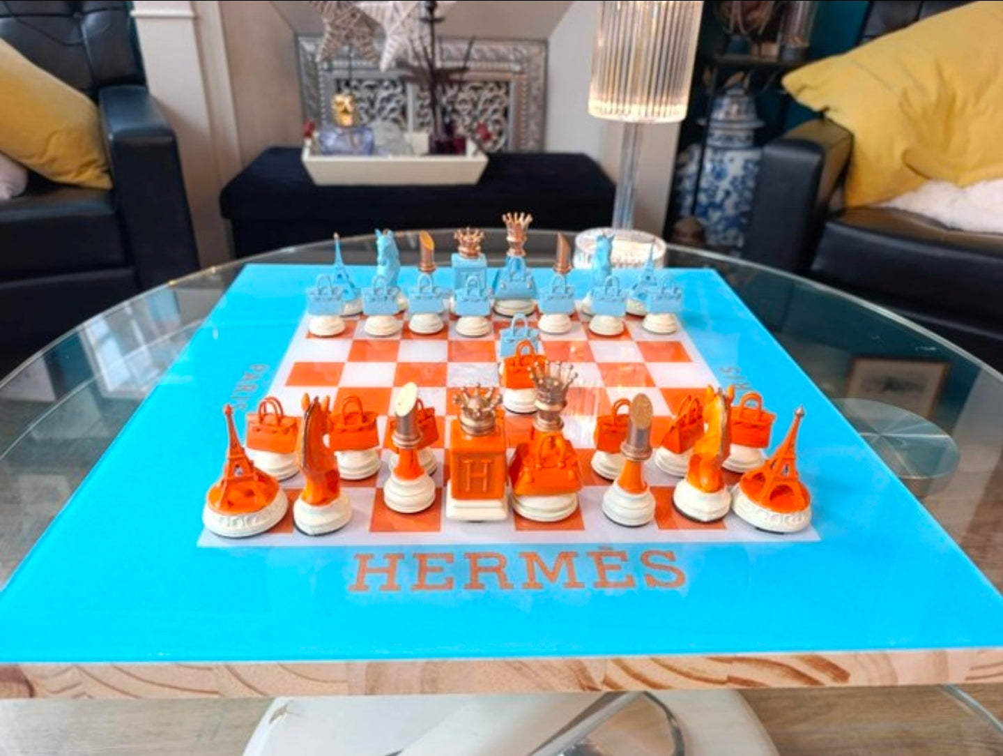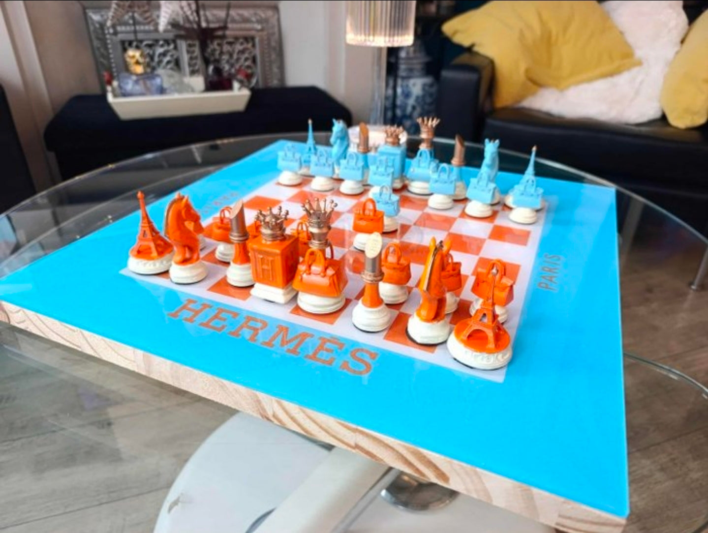 I pezzi, in resina pregiata verniciata a mano, alternano i toni azzurro Parigi e arancione Hermès in un raffinato contrasto cromatico. Ogni figura è ispirata all’immaginario della moda e dell’architettura: borse, rossetti, flaconi di profumo, cavalli e perfino la Torre Eiffel diventano protagonisti di un dialogo ironico e scultoreo.