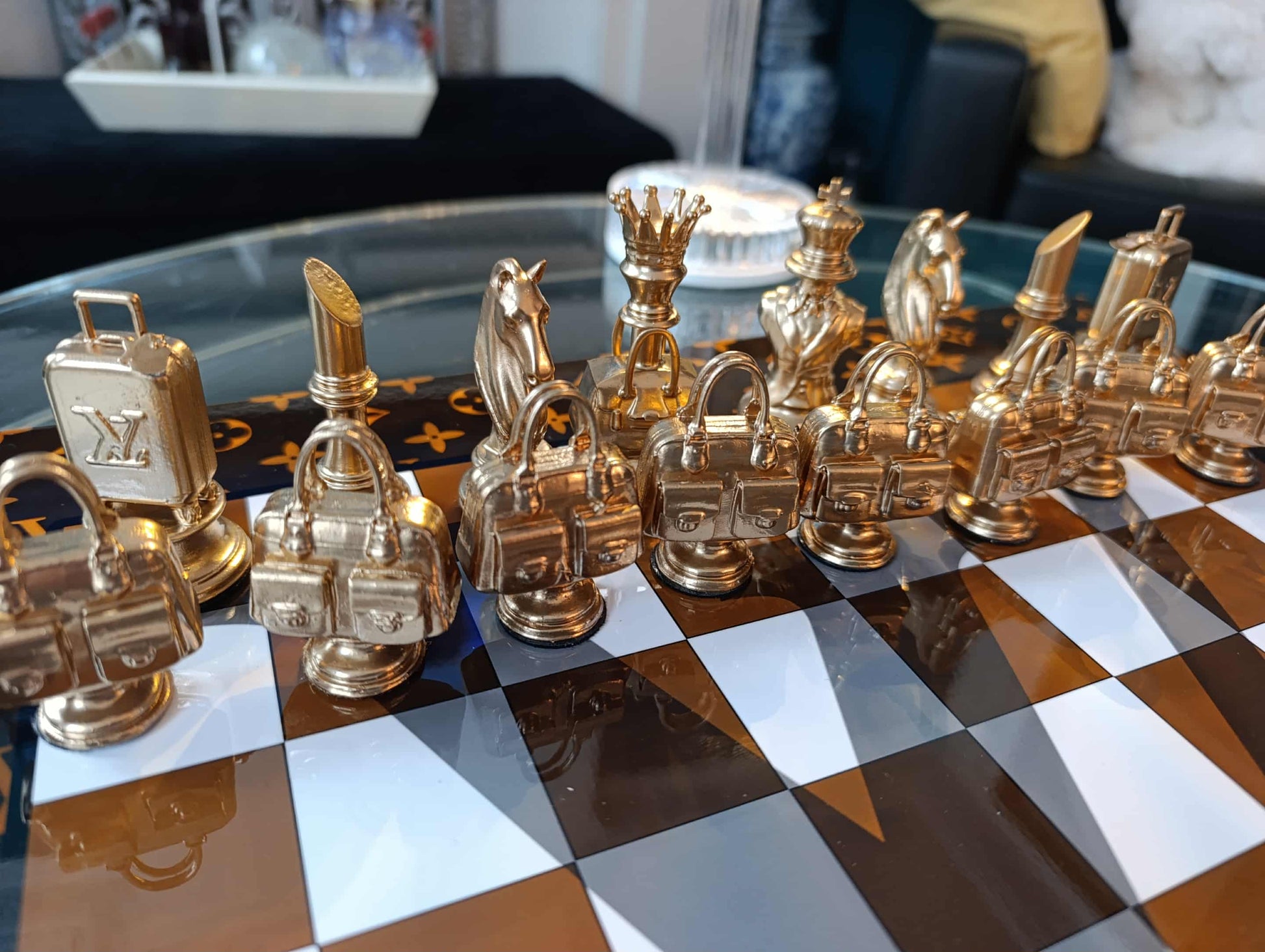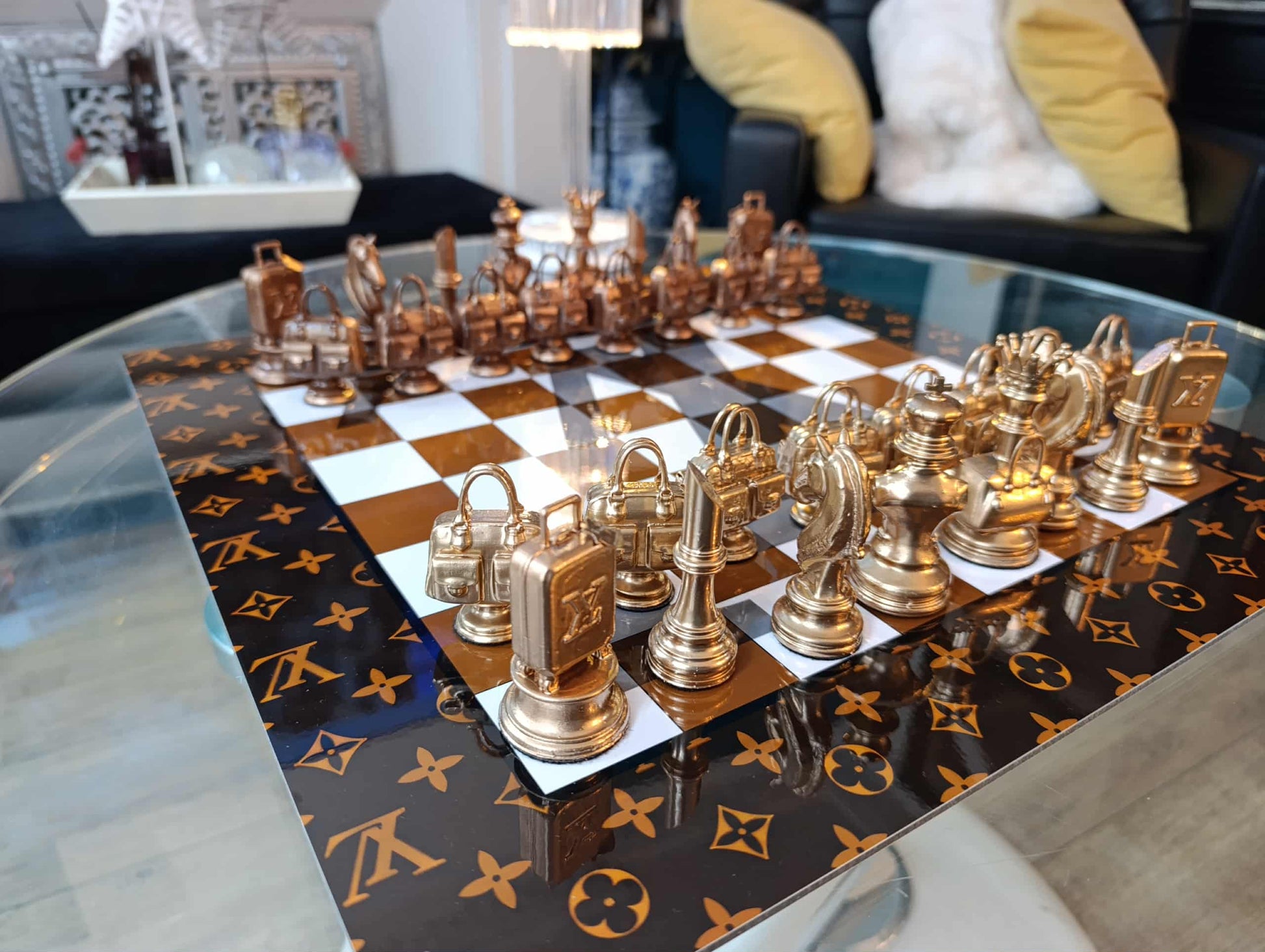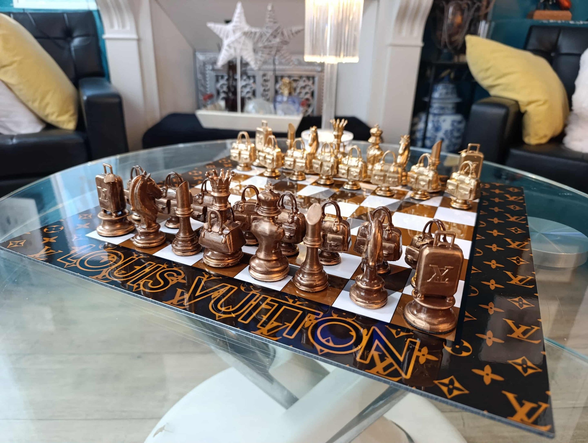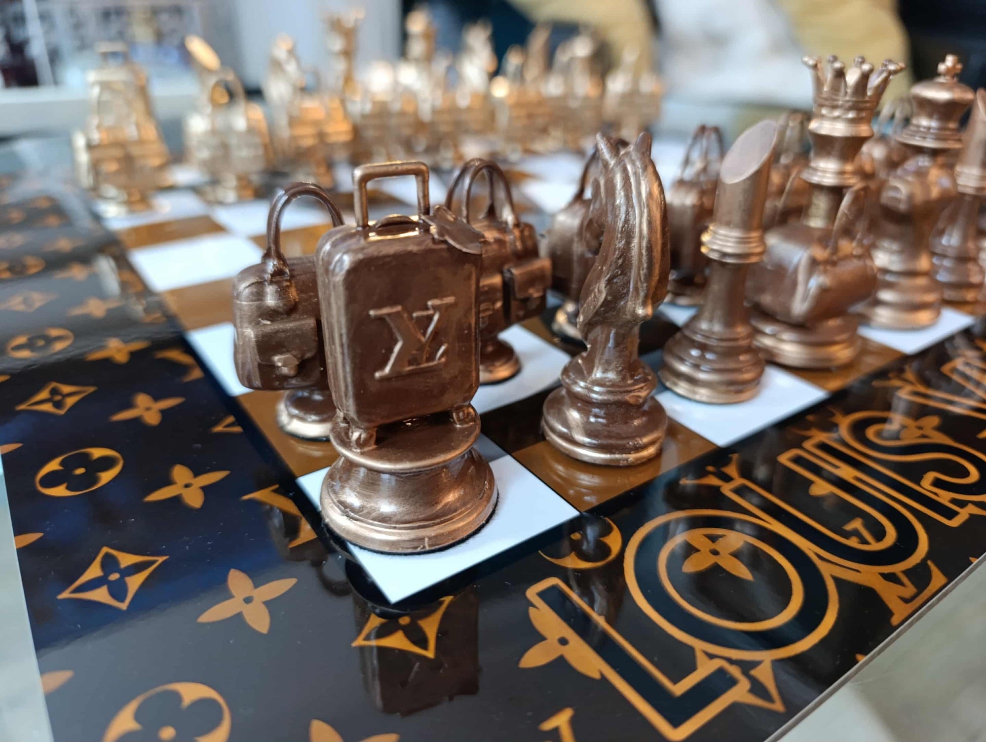 I pezzi, in resina pregiata verniciata a mano, reinterpretano borse e accessori iconici, ognuno con base in feltro, firma e numero unici. La scacchiera in alluminio verniciato è impreziosita dal motivo Louis Vuitton, simbolo di eleganza senza tempo.