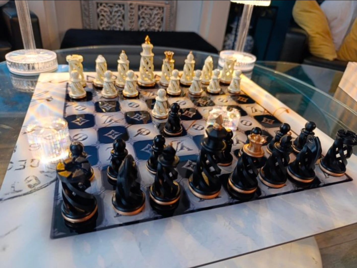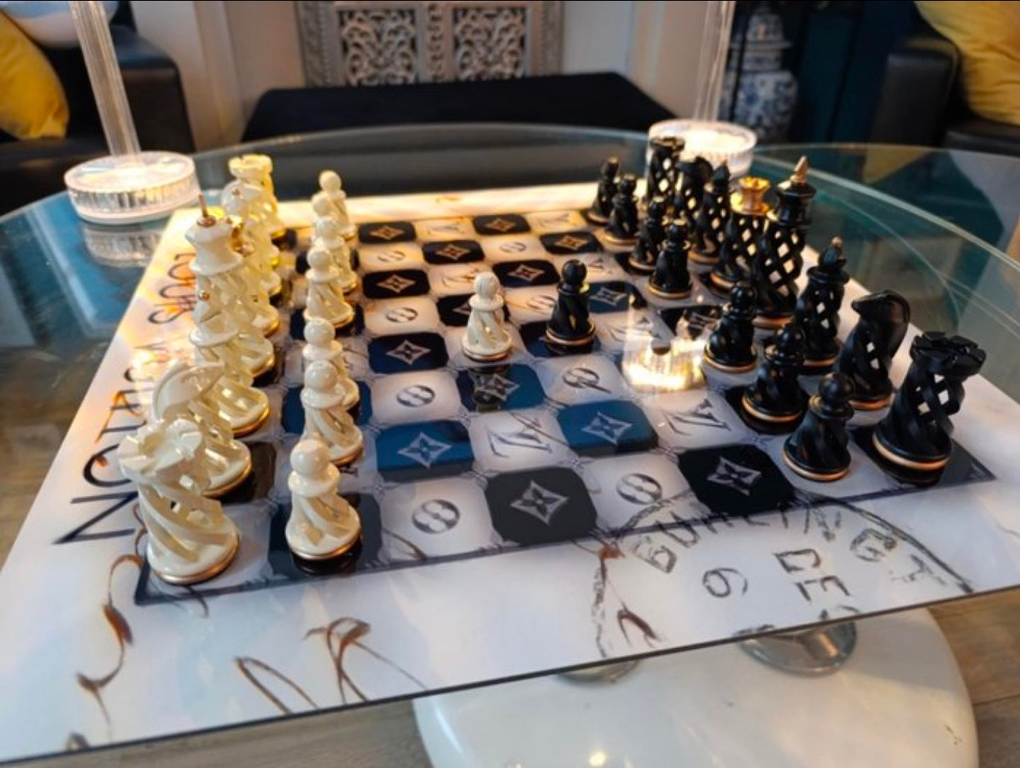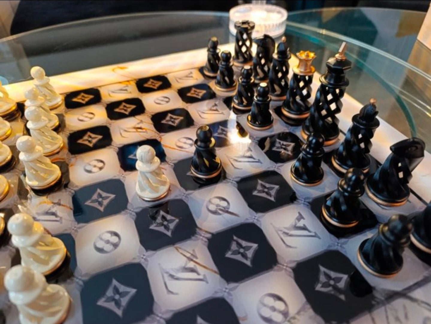 Realizzata in serie limitata, l’opera si distingue per la scacchiera in resina lucida e alluminio verniciato, decorata con il celebre motivo Louis Vuitton su fondo nero e avorio con venature dorate. I pezzi, in resina pregiata, sono verniciati a mano nelle tonalità Nero e Bianco, con forme scultoree e traforate che riflettono la luce come gioielli.