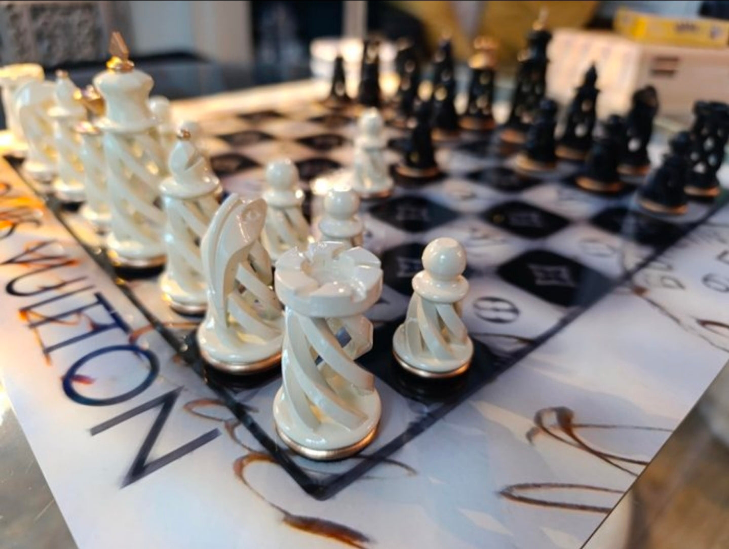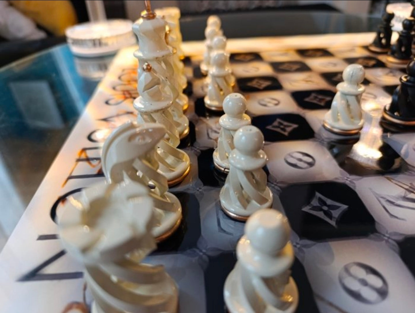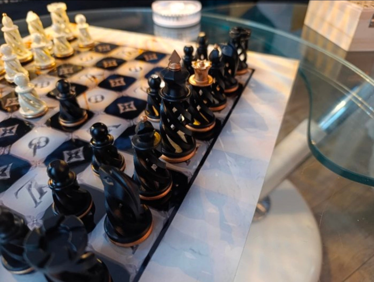 Realizzata in serie limitata, l’opera si distingue per la scacchiera in resina lucida e alluminio verniciato, decorata con il celebre motivo Louis Vuitton su fondo nero e avorio con venature dorate. I pezzi, in resina pregiata, sono verniciati a mano nelle tonalità Nero e Bianco, con forme scultoree e traforate che riflettono la luce come gioielli.