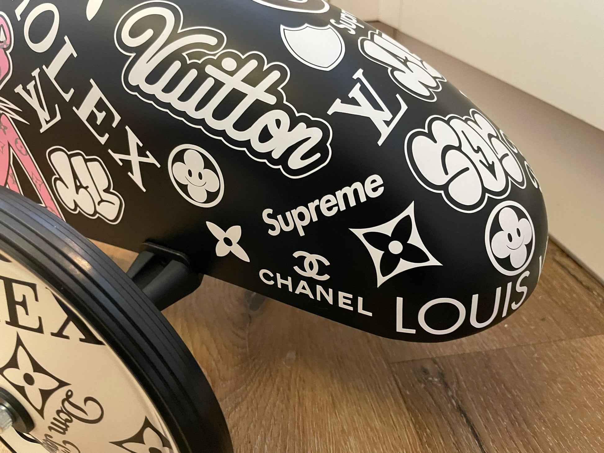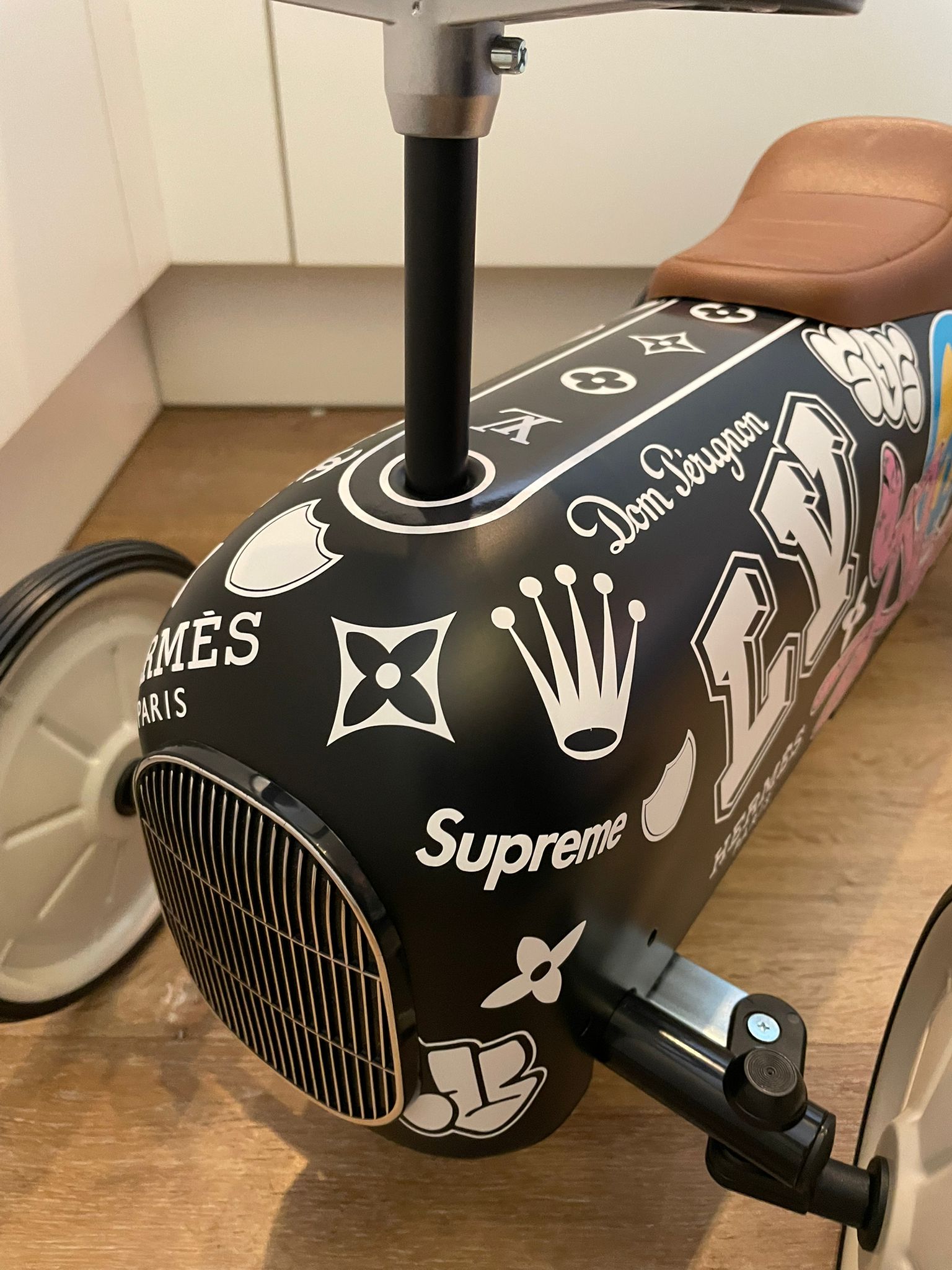 Auto a pedali in metallo completamente personalizzata con grafiche ispirate ai più celebri brand del mondo fashion e pop culture. La carrozzeria opaca nera è decorata con sticker in stile street-luxury e con un’illustrazione della Pantera Rosa, per un look unico e ricercato. Sedile ergonomico, volante stabile e ruote decorate completano questo modello esclusivo, ideale come giocattolo di alta qualità o come pezzo da collezione e arredo.